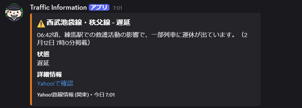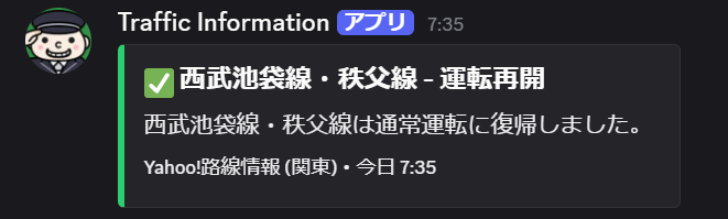 このコマンドはコマンドを使用したチャンネルに運行情報を掲載します。具体的に運転見合わせや遅延が生じたときと通常運転に戻った時に通知されます。