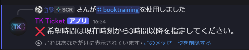 - 訓練の申し込みは開始時刻の3時間後である必要があります。3時間以内の申し込みは画像のようなエラーが表示されます: