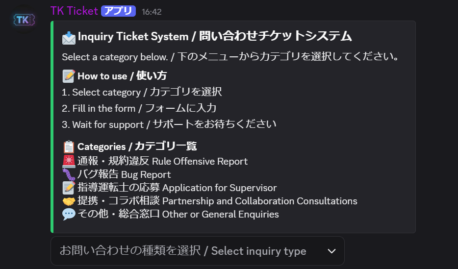 さて、組織再編成に伴い従来のチケットシステムも更新しました。今まではTicket Toolを使い、お問い合わせや個別訓練の申し込みなどを行っていました。しかし、無料枠で使用している分制約も多く、少々使いづらい部分がありました。そこで、鉄道訓練部独自で新しいBot:「TK Ticket」を使用することで今までのチケットサービスに加えて様々な申し込みなどが簡単になります。今回は主な使い方や従来のシステムからの変更点について紹介します。