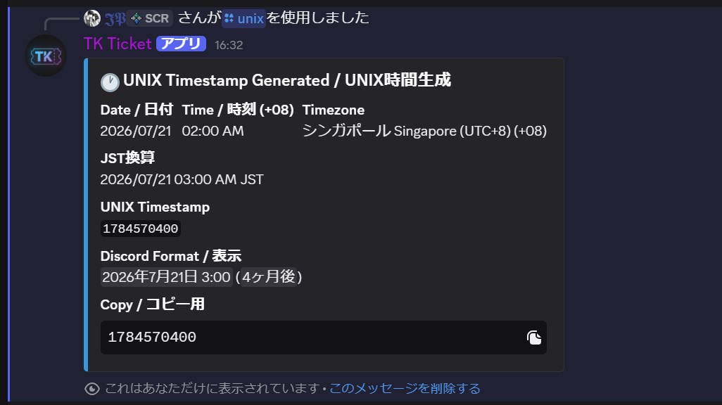 正しく入力することでこのようにUNIX時間が表示されます。このUNIX時間を使って個別訓練のUNIX時間記入欄に活用することができます。このCopy/コピー用からUNIX時間をコピーしてください。モバイル版をご利用の方はメモを取るなどして対応をしてください。