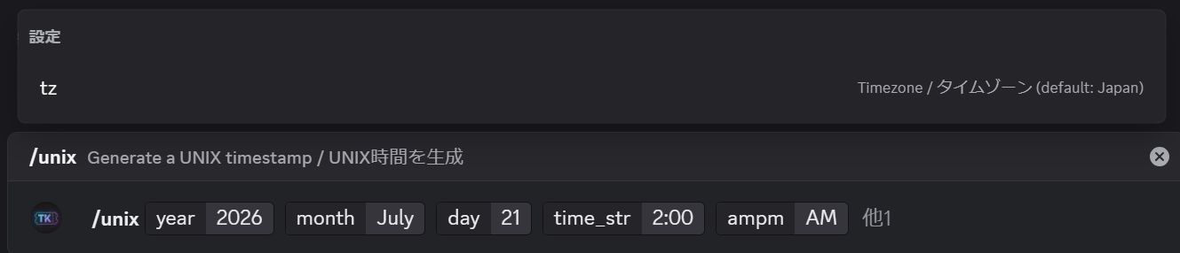 tzはtimezoneの略でタイムゾーンを選択できます。尚、選択しなくても日本の標準時(GTC+9)で計算されます。