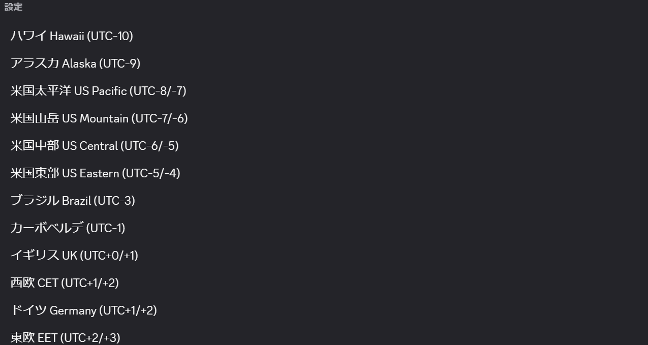 このように選択肢が複数あるのでご自身が住んでいる国にあったタイムゾーンを選択してください。尚、サマータイムは考慮できるように設定しています。ちなみに画像に表示されているタイムゾーンはリストの全てではないです。下にまだありますがここでは割愛します。