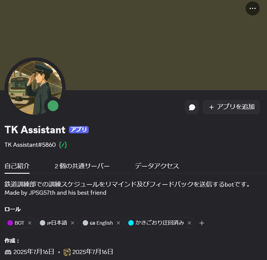 こんにちは、鉄道訓練部管理者のJPSG57thです。TK Assistantは鉄道訓練部のサーバーにおける多機能Botです。そして私が人生で初めてまともに稼働したBotであり、運用開始の25年7月から約7か月も頑張ってい […]